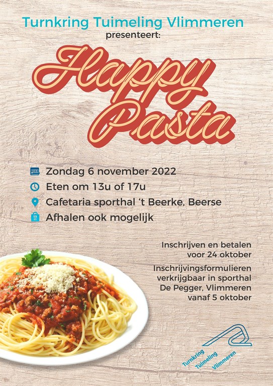Op zondag 6 november 2022 organiseren we in de cafetaria van sportcentrum 't Beerke opnieuw onze Happy Pasta! Je kan 's middags of 's avonds komen genieten van een lekker bord pasta en een dessertje naar keuze. Dranken zijn verkrijgbaar aan democratische prijzen. Of kom je bestelling afhalen, warm hem op, en geniet thuis van dezelfde lekkere pasta. Ook zo kan je onze club steunen, want met de opbrengst kunnen we al onze huidige én toekomstige leden nog meer van hun sport laten genieten!